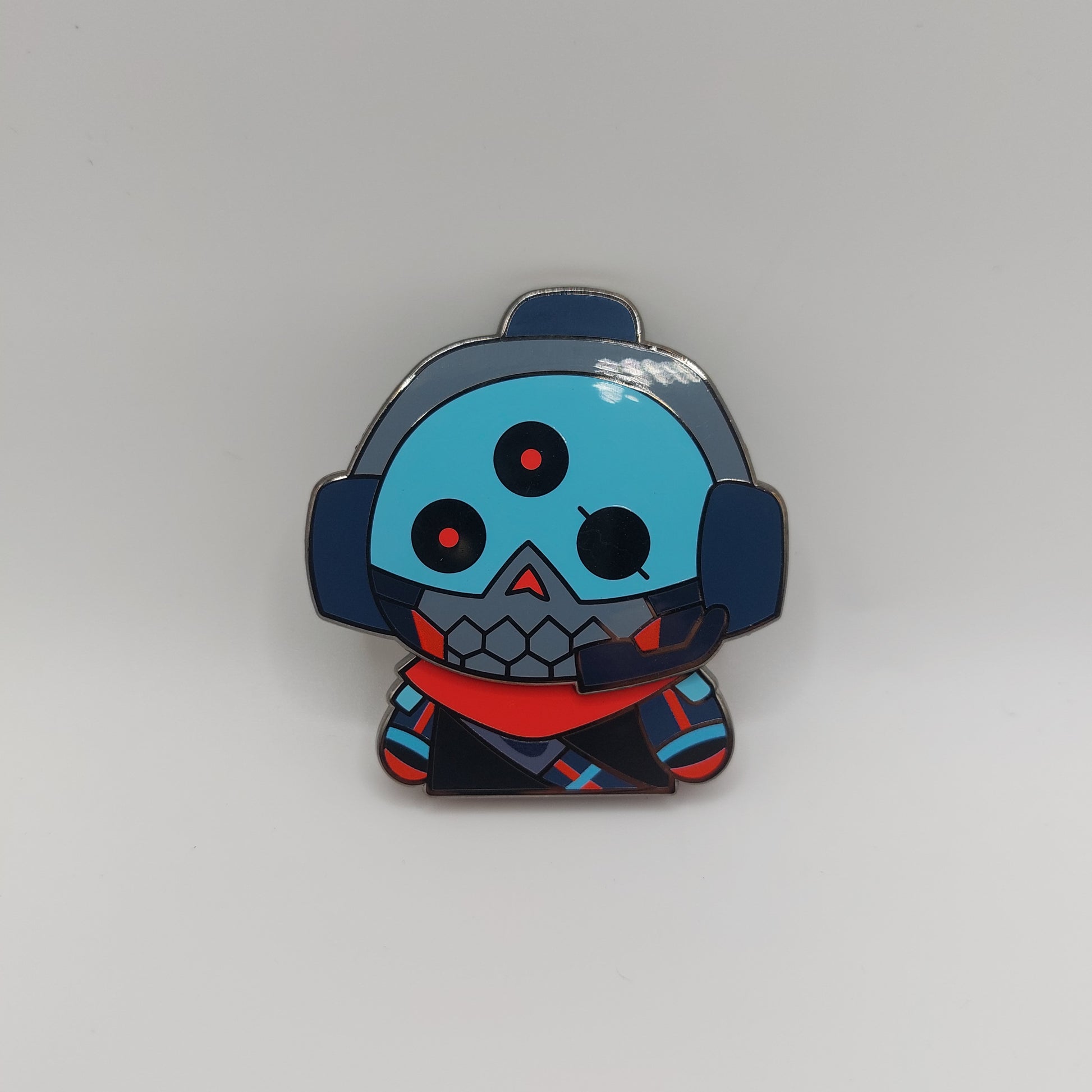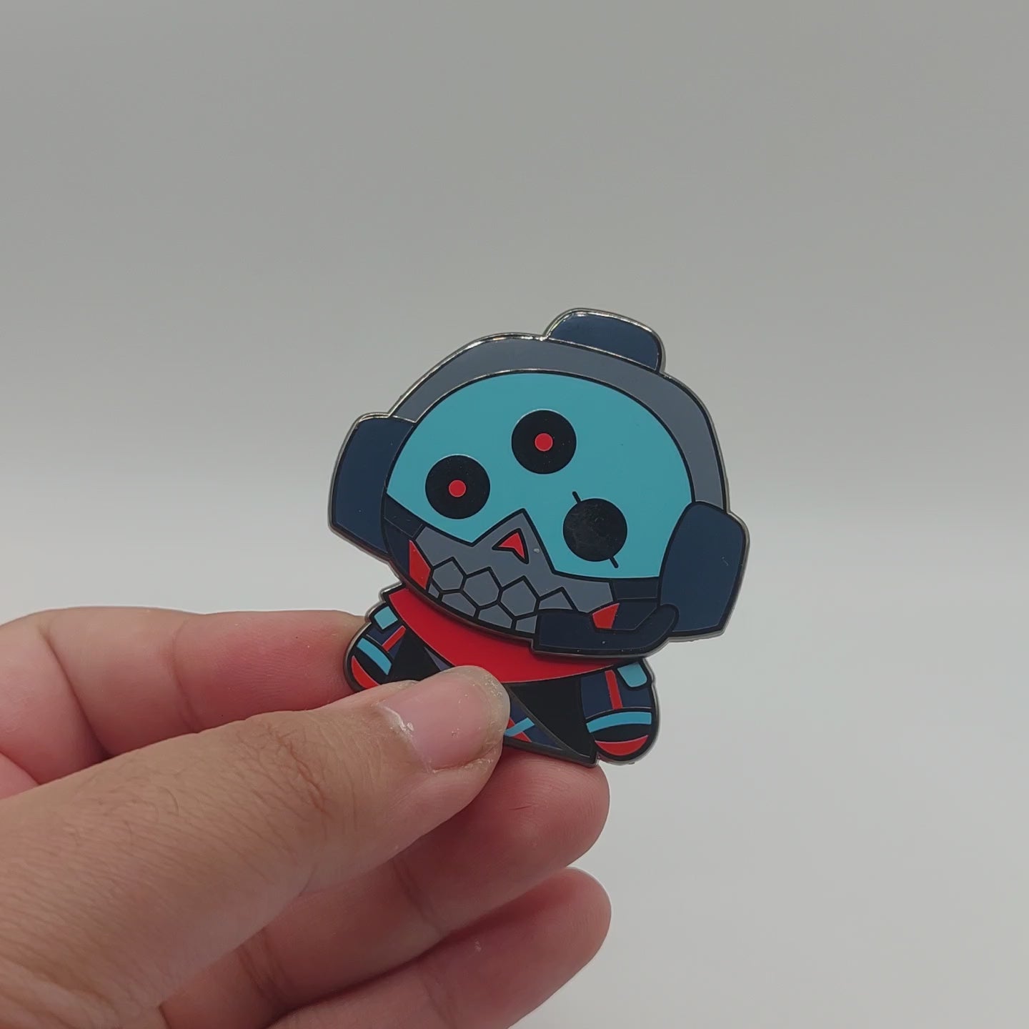 A cute little wiggling hard enamel pin of VTuber Skullvolver.
